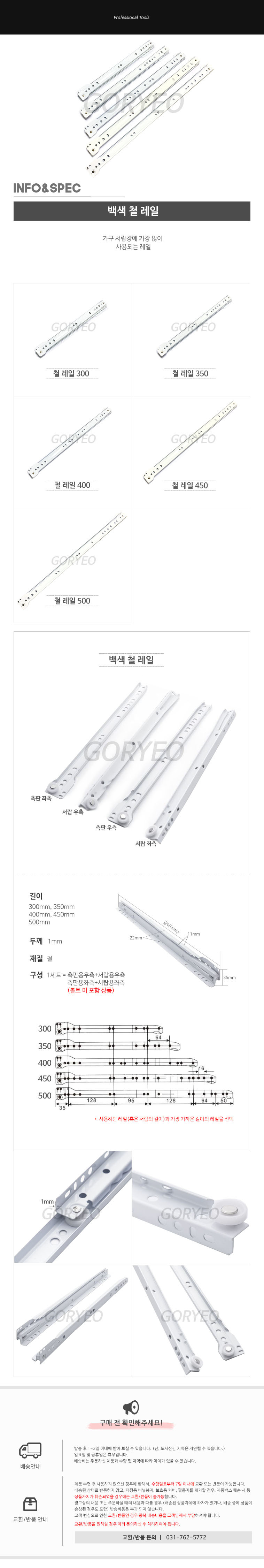서랍장 가구 철레일 백색레일 300 350 400 500mm