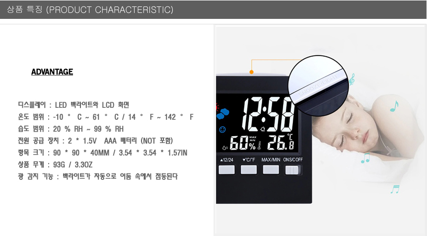 디지털 온도계 습도계 LCD 시계 알람 스누즈 달력