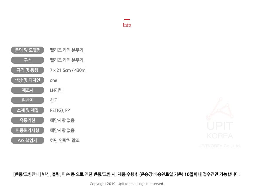 • 초기제품 이상의 경우 동일한 제품으로 1:1 교환원칙, 사용후 제품이상은 A/S를 원칙으로 합니다.