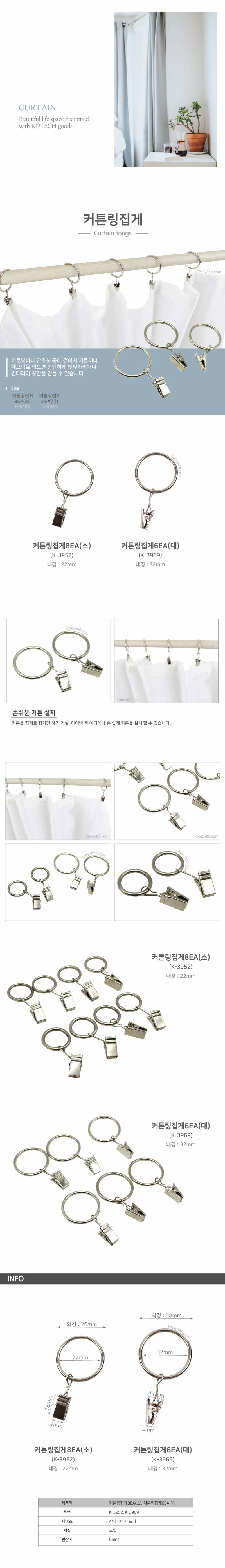 코텍 커튼링 집게-소 8P내경22MM