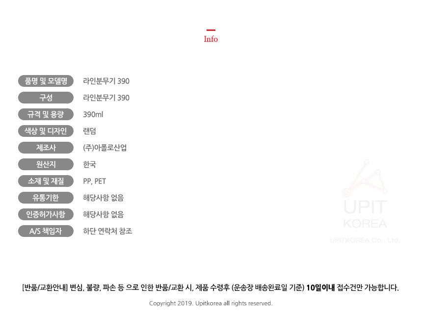 • 반품/환불조건: 도착후 1주일 이내 사용하지 않은 상태에서 가능합니다,초기제품 이상의 경우 동일한 제품으로 1:1 교환원칙, 사용후 제품이상은 A/S를 원칙으로 합니다,