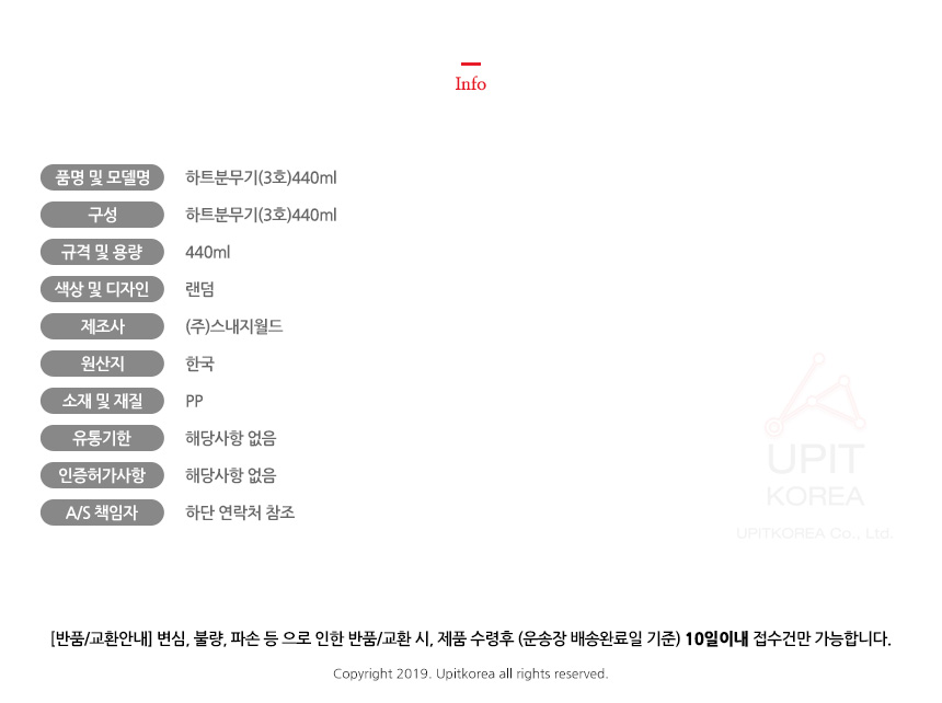 • 초기제품 이상의 경우 동일한 제품으로 1:1 교환원칙, 사용후 제품이상은 A/S를 원칙으로 합니다.