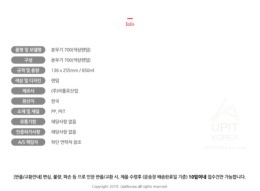 • 초기제품 이상의 경우 동일한 제품으로 1:1 교환원칙, 사용후 제품이상은 A/S를 원칙으로 합니다.
