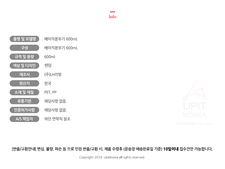 • 초기제품 이상의 경우 동일한 제품으로 1:1 교환원칙, 사용후 제품이상은 A/S를 원칙으로 합니다.