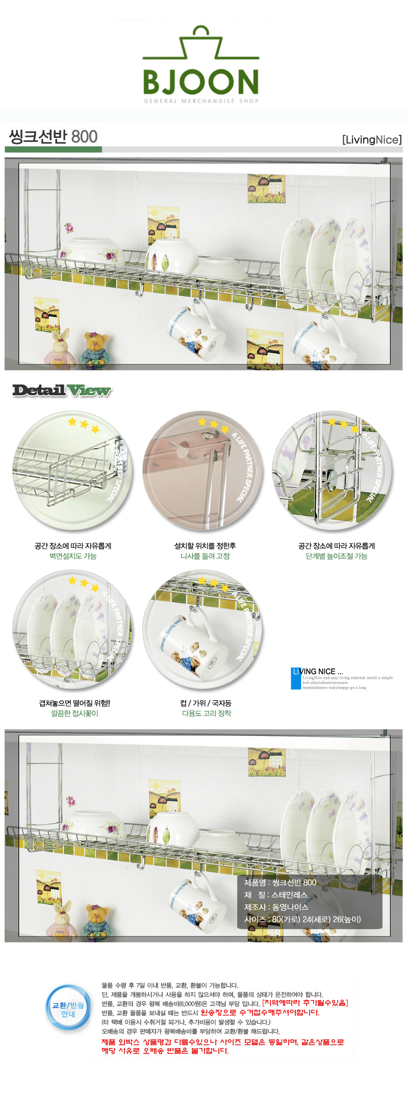 1. 품명 및 모델명 : 씽크 선반 800 스텐레스 주방 수납 다용도 다목적 / 상세정보별도표시