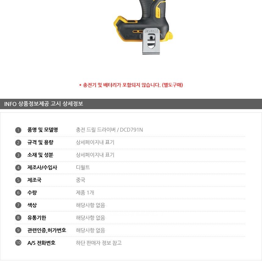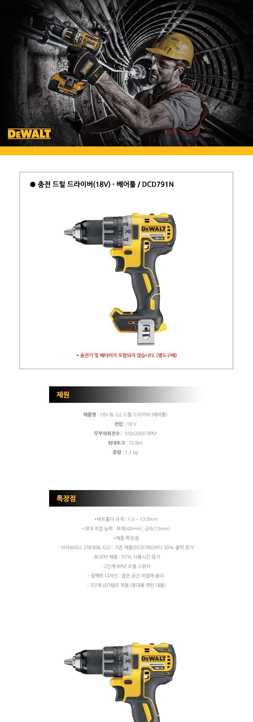 문구3 생활용품 디월트 충전 드라이버 드릴 베어툴 DCD791N 18V 이미지/