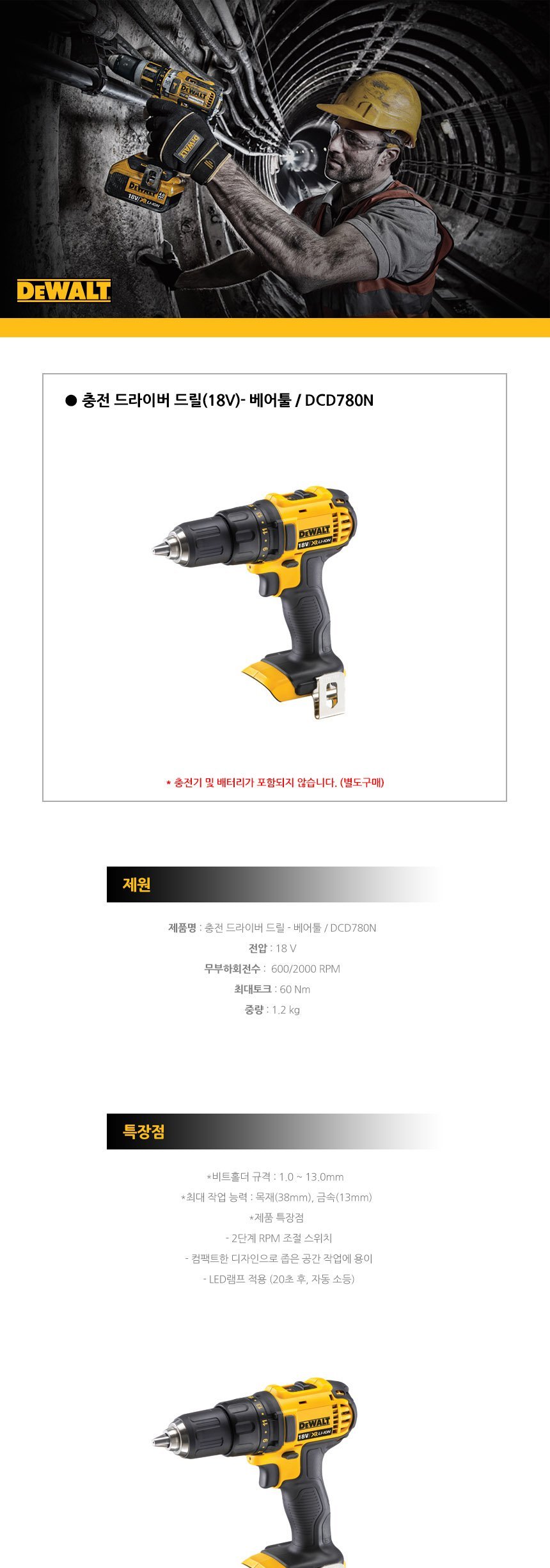 문구3 생활용품 디월트 충전 드라이버 드릴 베어툴 DCD780N 18V