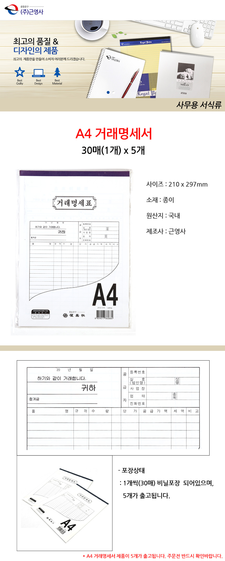 문구3 생활용품 근영사 A4 거래명세서 5개입 수기거래명세서 이미지/