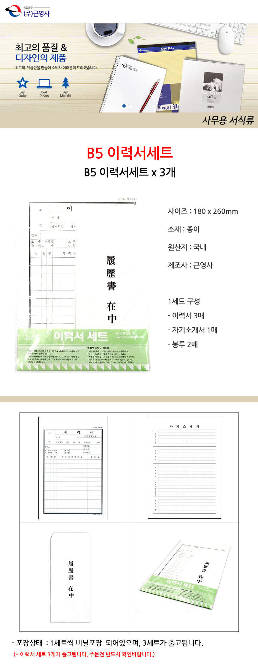 문구3 생활용품 근영사 B5 이력서세트 3개입