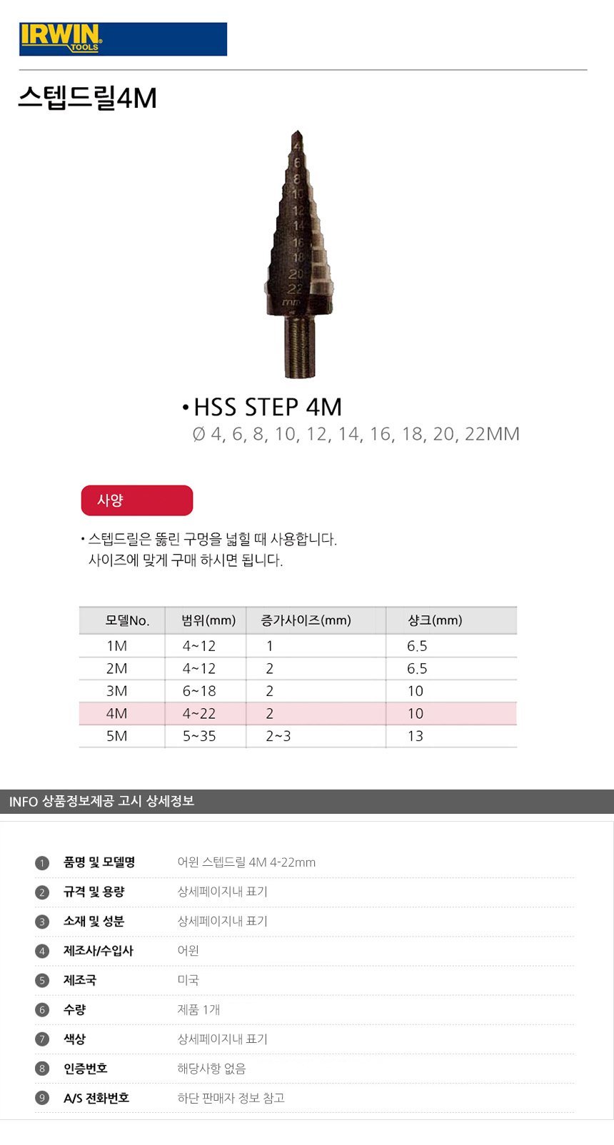 문구3 생활용품 어윈 스텝드릴 4M 4-22mm