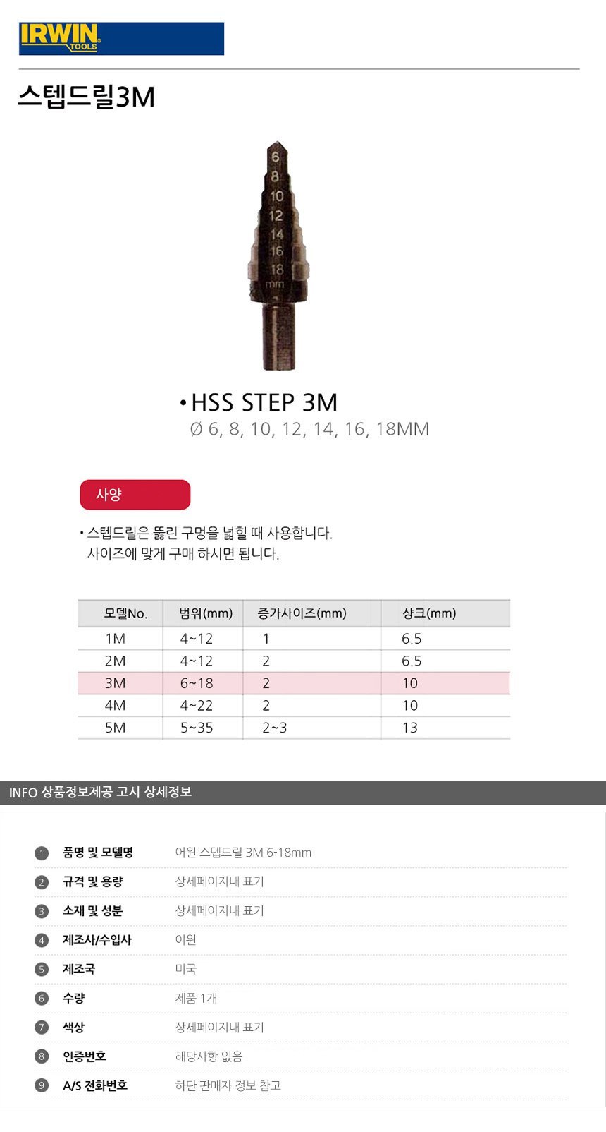 문구3 생활용품 어윈 스텝드릴 3M 6-18mm