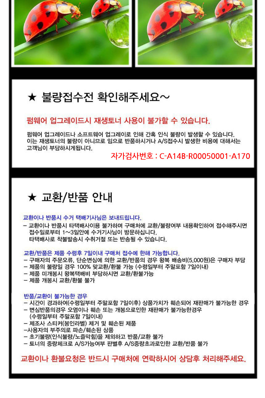 • 초기제품 이상의 경우 동일한 제품으로 1:1 교환원칙, 사용후 제품이상은 A/S를 원칙으로 합니다.