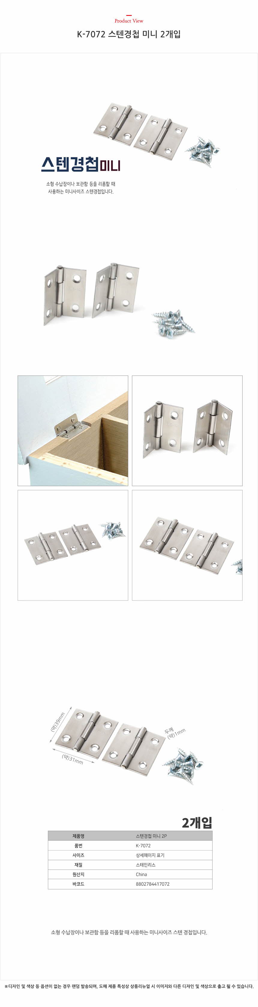 K-7072 스텐경첩 미니 2개입