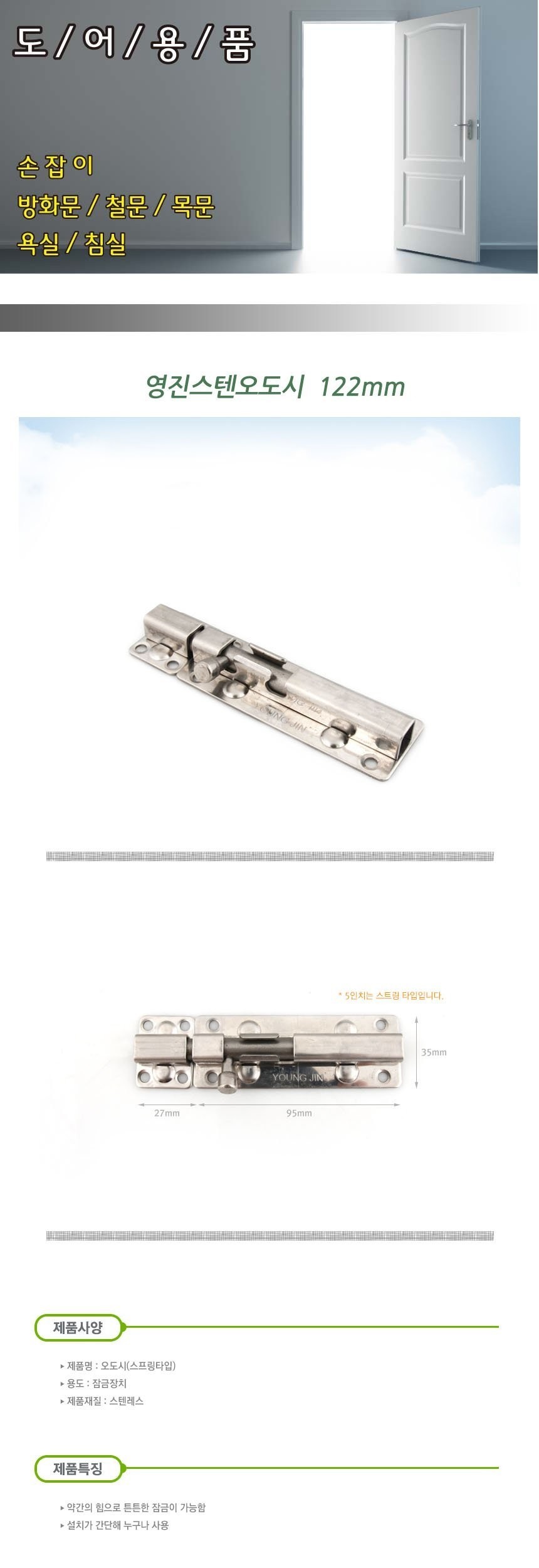 영진 스텐오도시 122mm 스프링 잠금쇠 잠금장치