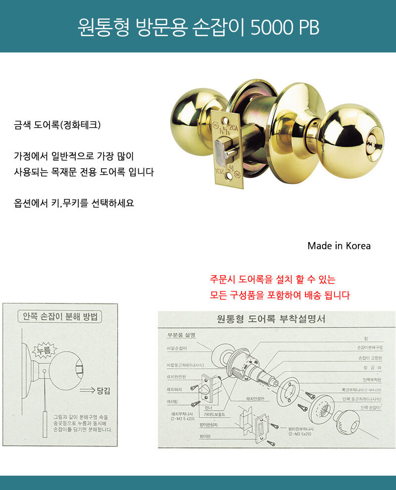 원통형 방문 손잡이 5000PB 열쇠 방문 방화문 손잡이 도어락 DIY 공구 목공구 철물