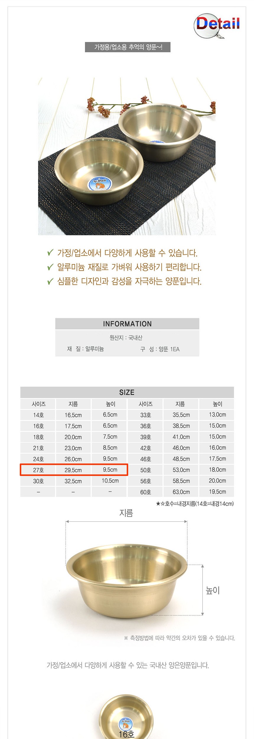 국내산 양은 양푼이 27호 양은양푼 믹싱볼 비빔그릇 무침볼 노란그릇 밥그릇 옛날그릇 양푼이