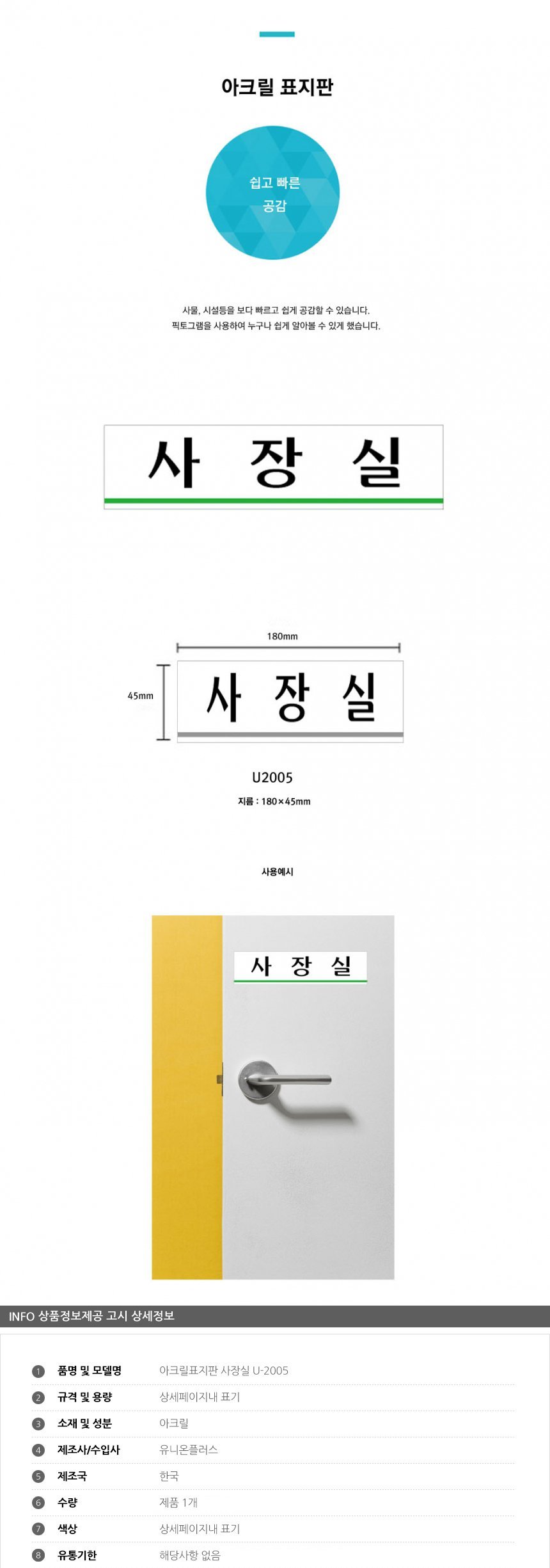 아크릴표지판 사장실 U-2005 180x45x2mm 사인 표찰 안내판 팻말 쇼케이스 디자