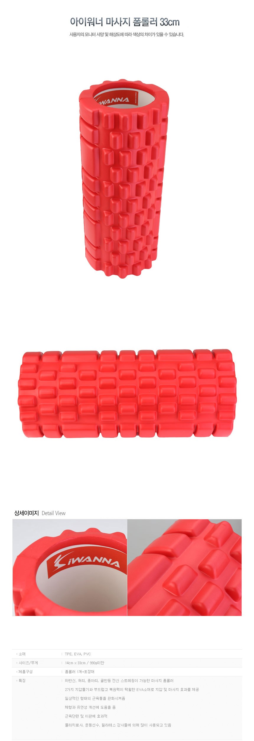 아이워너 마사지 폼롤러 33cm 레드 운동 기구 스트레칭 헬스 홈트
