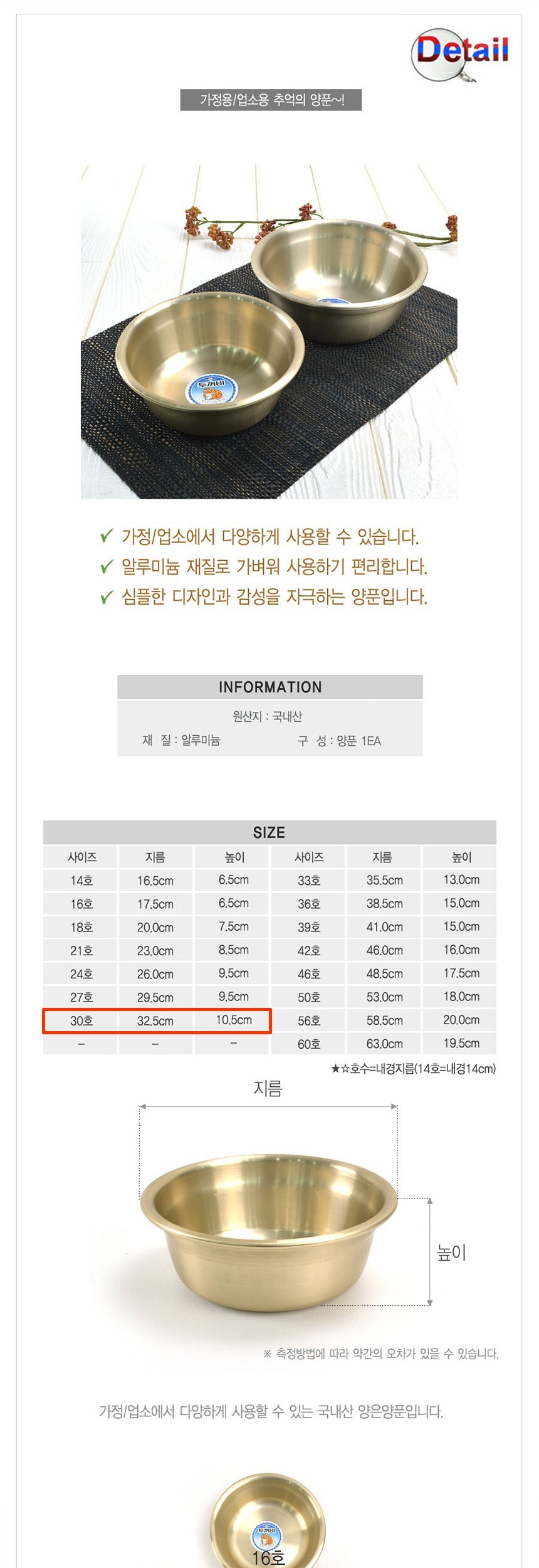 국내산 양은 양푼이 30호 양은양푼 믹싱볼 비빔그릇 무침볼 노란그릇 밥그릇 옛날그릇 양푼이