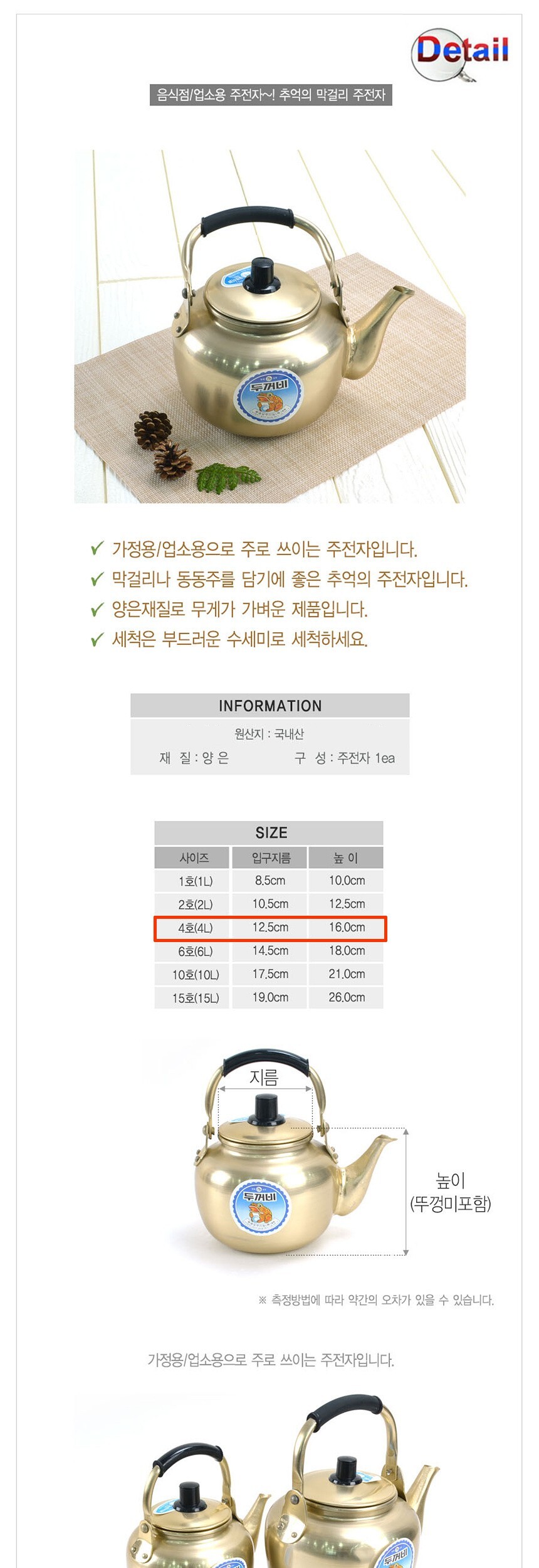 양은 막걸리 주전자 4호 4리터 주전자 양은주전자 황주전자 노란주전자 추억의주전자 시골주전
