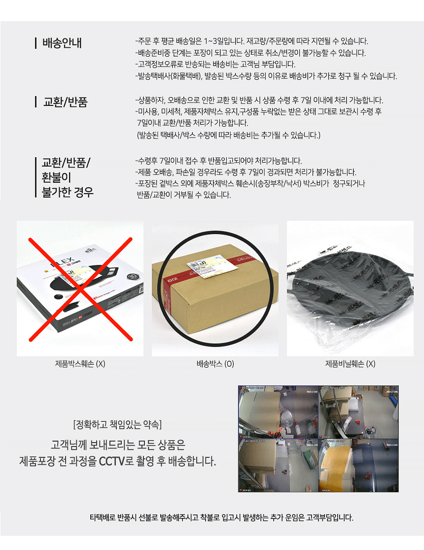 • 초기제품 이상의 경우 동일한 제품으로 1:1 교환원칙, 사용후 제품이상은 A/S를 원칙으로 합니다.