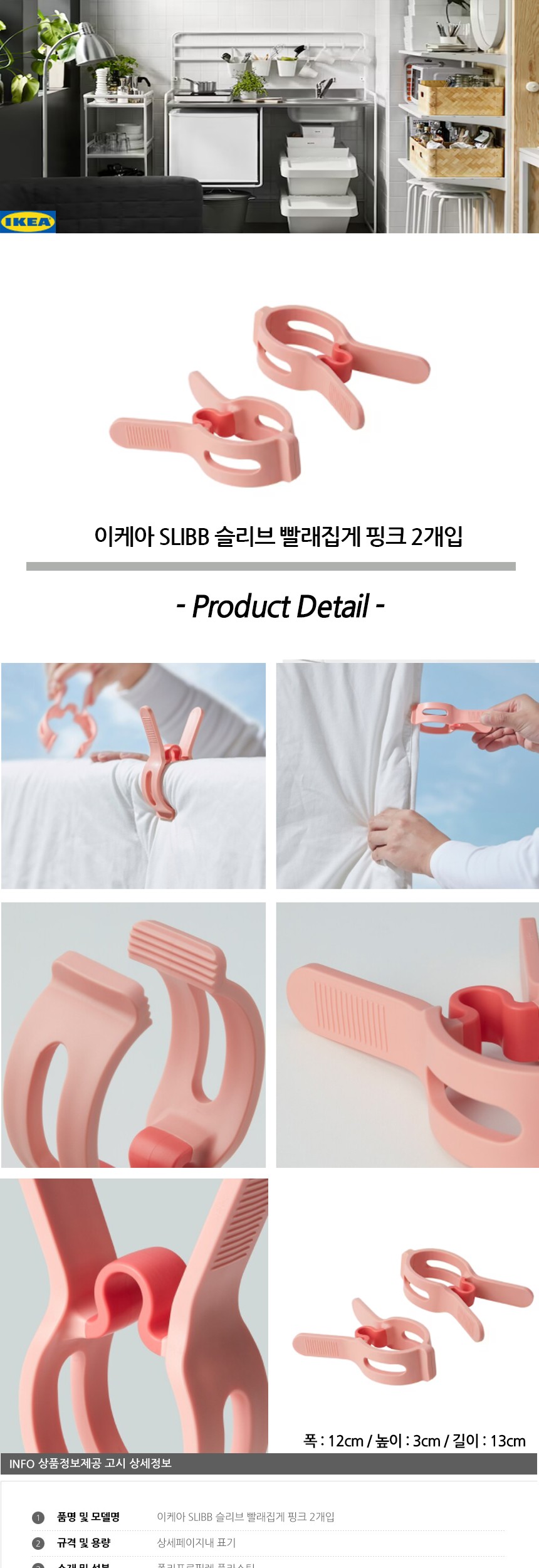 이케아 SLIBB 슬리브 빨래집게 핑크 2개입 빨래건조 줄빨래집게 세탁집게 양말집게 세탁용