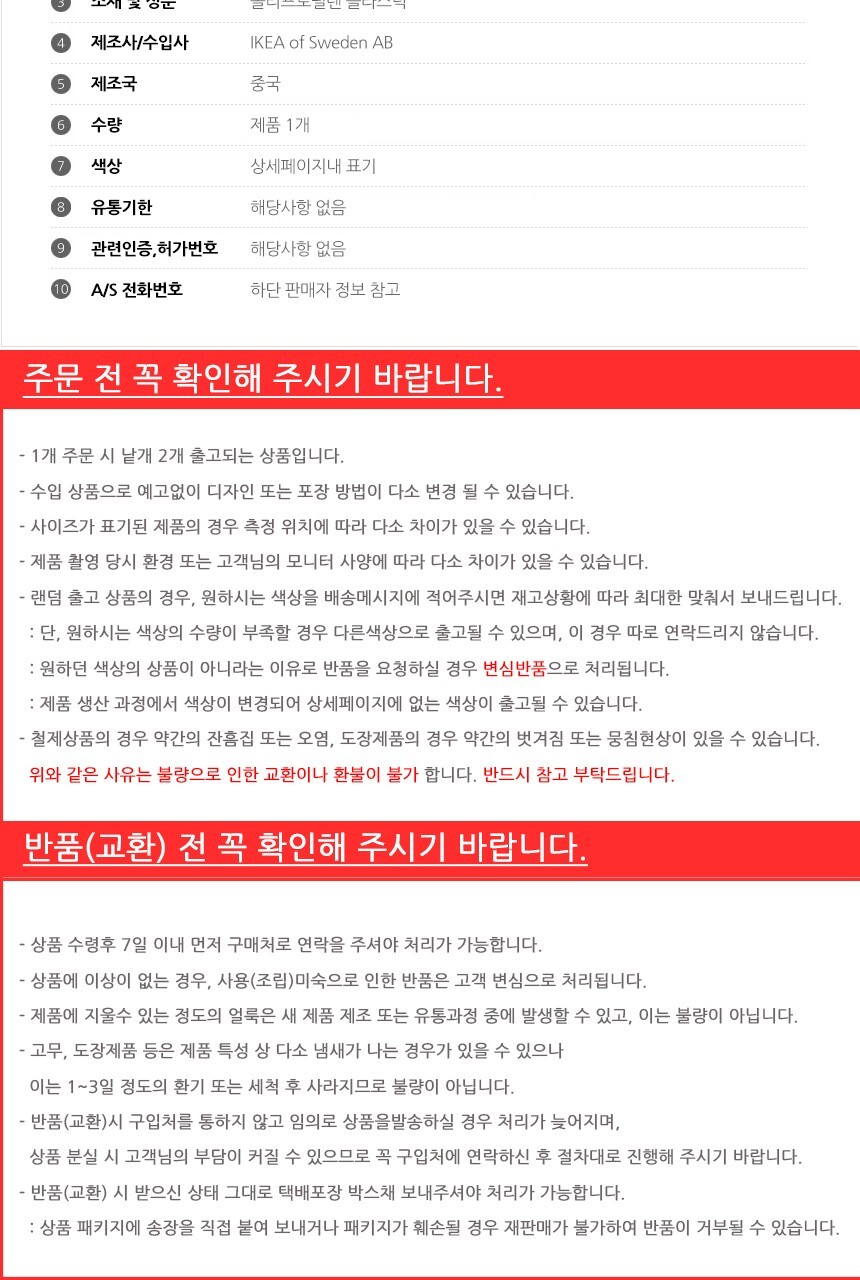• 반품/환불조건: 도착후 1주일 이내 사용하지 않은 상태에서 가능합니다,초기제품 이상의 경우 동일한 제품으로 1:1 교환원칙, 사용후 제품이상은 A/S를 원칙으로 합니다,