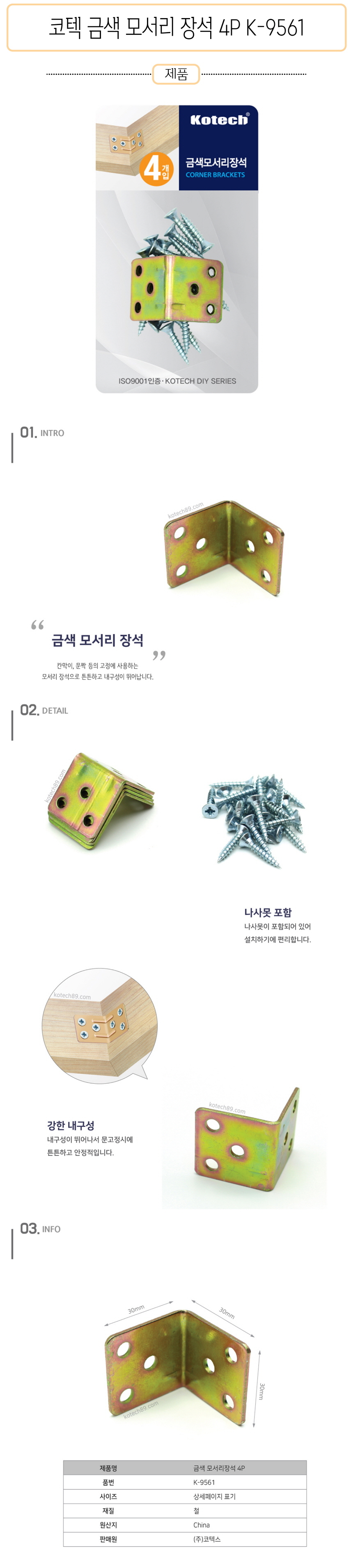 코텍 금색 모서리 장석 4P K-9561-D 선반고정/선반브라켓/코너선반