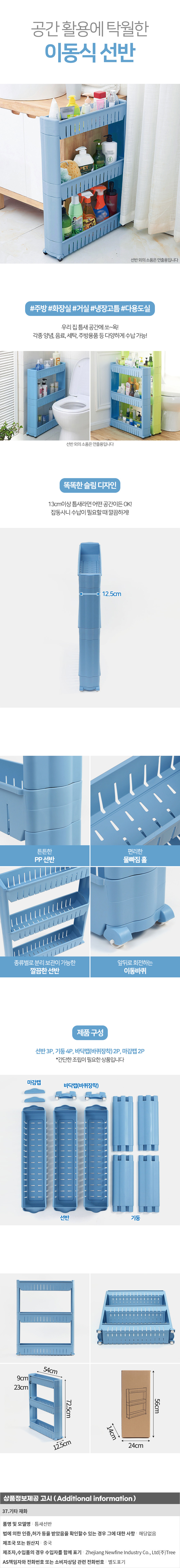 공간활용 3단 이동식 틈새선반 블루 틈새수납선반