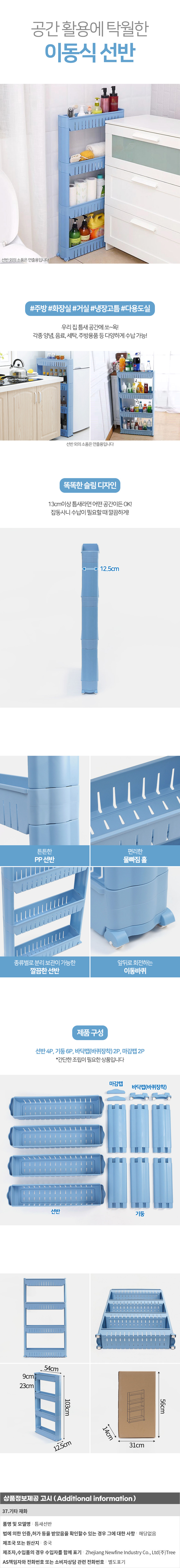공간활용 4단 이동식 틈새선반 블루 물건정리트레이 이미지/