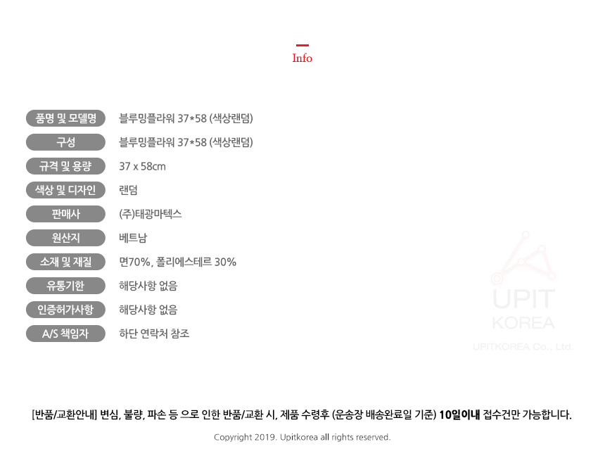 • 반품/환불조건: 도착후 1주일 이내 사용하지 않은 상태에서 가능합니다,초기제품 이상의 경우 동일한 제품으로 1:1 교환원칙, 사용후 제품이상은 A/S를 원칙으로 합니다,
