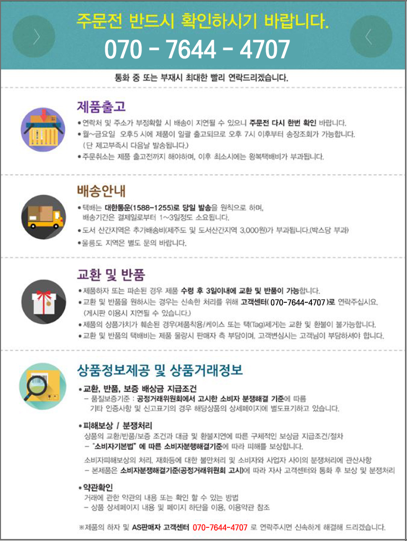 • 반품/환불조건: 도착후 1주일 이내 사용하지 않은 상태에서 가능합니다,초기제품 이상의 경우 동일한 제품으로 1:1 교환원칙, 사용후 제품이상은 A/S를 원칙으로 합니다,