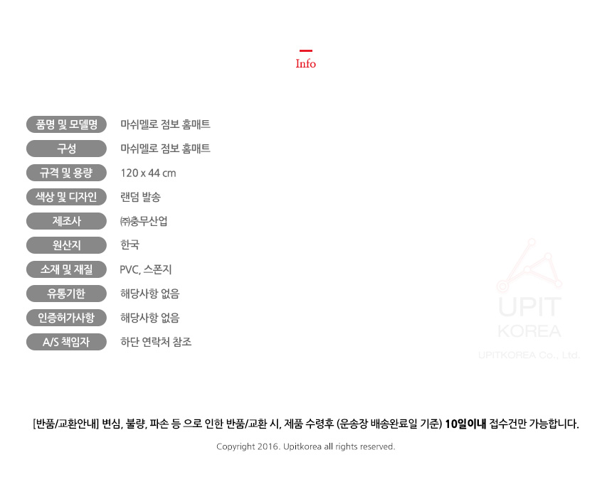 • 반품/환불조건: 도착후 1주일 이내 사용하지 않은 상태에서 가능합니다,초기제품 이상의 경우 동일한 제품으로 1:1 교환원칙, 사용후 제품이상은 A/S를 원칙으로 합니다,