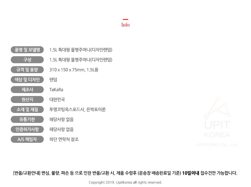 • 반품/환불조건: 도착후 1주일 이내 사용하지 않은 상태에서 가능합니다,초기제품 이상의 경우 동일한 제품으로 1:1 교환원칙, 사용후 제품이상은 A/S를 원칙으로 합니다,