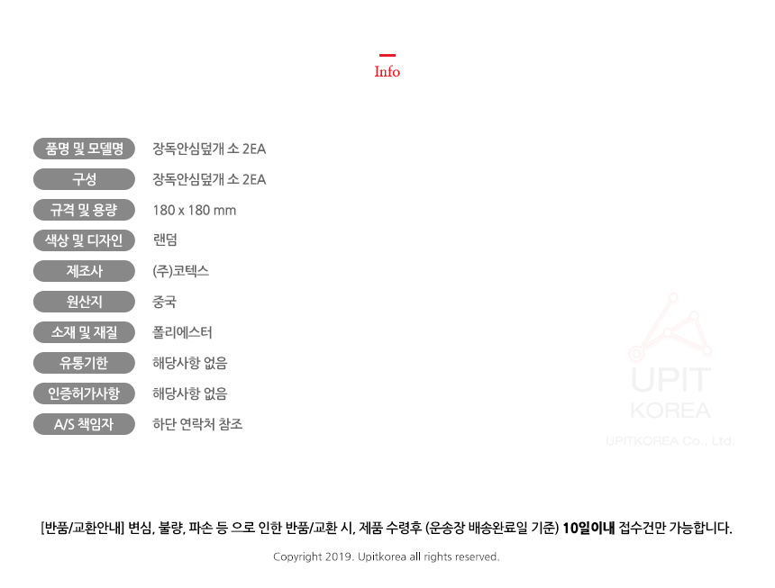 • 반품/환불조건: 도착후 1주일 이내 사용하지 않은 상태에서 가능합니다,초기제품 이상의 경우 동일한 제품으로 1:1 교환원칙, 사용후 제품이상은 A/S를 원칙으로 합니다,