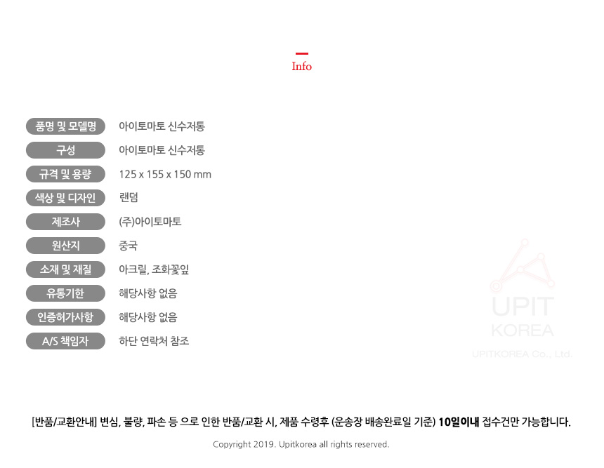 • 초기제품 이상의 경우 동일한 제품으로 1:1 교환원칙, 사용후 제품이상은 A/S를 원칙으로 합니다.