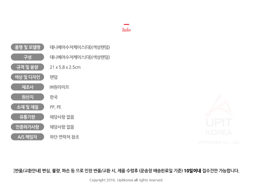 • 반품/환불조건: 도착후 1주일 이내 사용하지 않은 상태에서 가능합니다,초기제품 이상의 경우 동일한 제품으로 1:1 교환원칙, 사용후 제품이상은 A/S를 원칙으로 합니다,