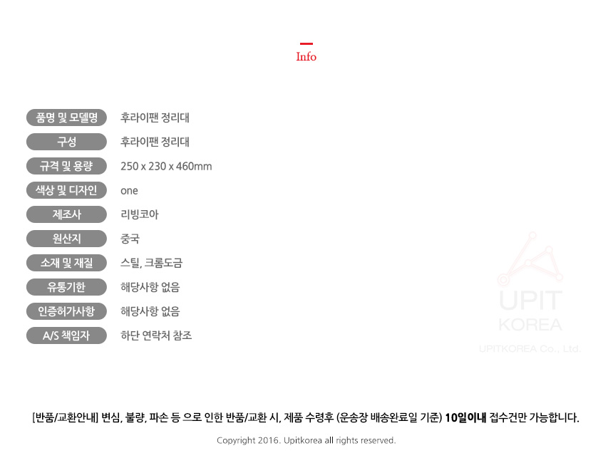 • 반품/환불조건: 도착후 1주일 이내 사용하지 않은 상태에서 가능합니다,초기제품 이상의 경우 동일한 제품으로 1:1 교환원칙, 사용후 제품이상은 A/S를 원칙으로 합니다,
