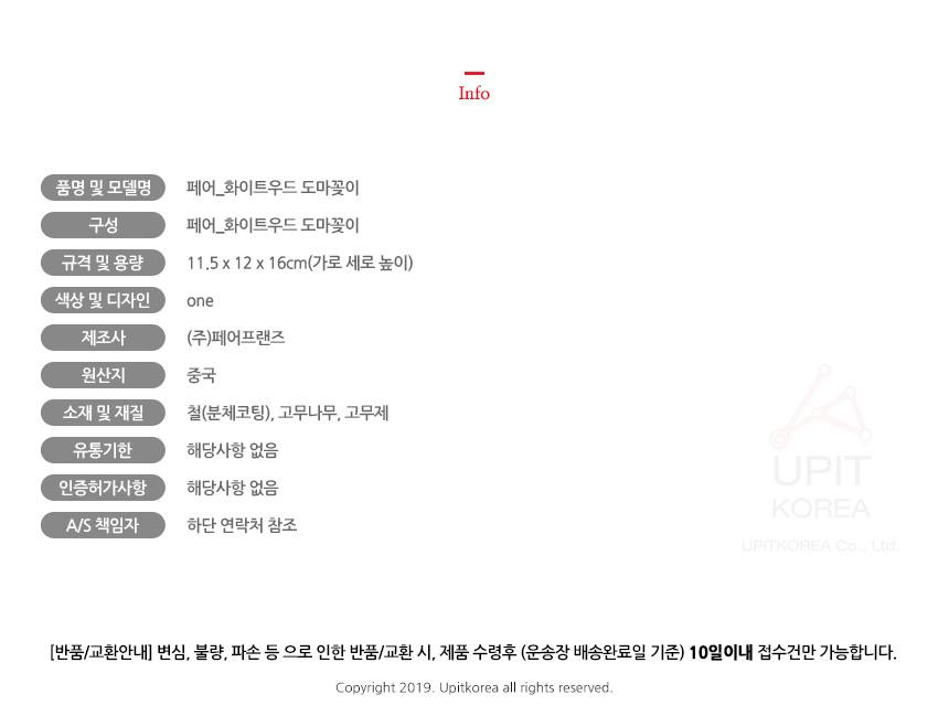 • 초기제품 이상의 경우 동일한 제품으로 1:1 교환원칙, 사용후 제품이상은 A/S를 원칙으로 합니다.