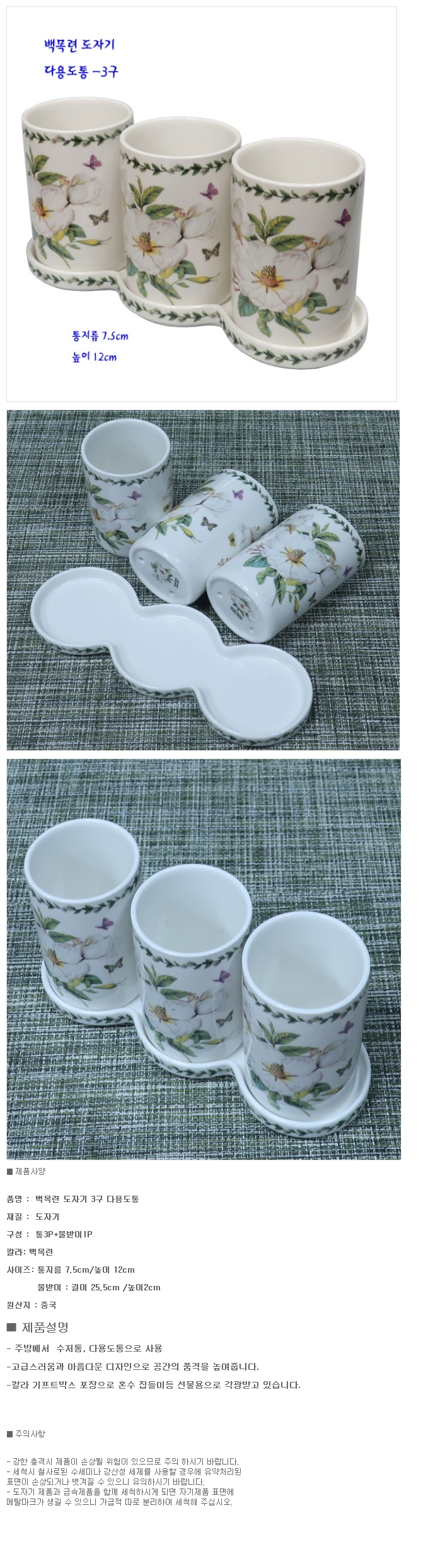 백련 도자기 수저통 수저꽂이 물빠짐 수저통 3구 이미지/