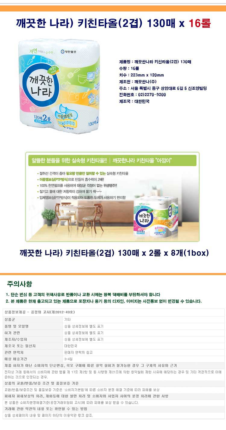 깨끗한나라키친타올130매x16롤/휴지/화장지/욕실용품/두루마리화장지/두루마리휴지/롤휴지/티