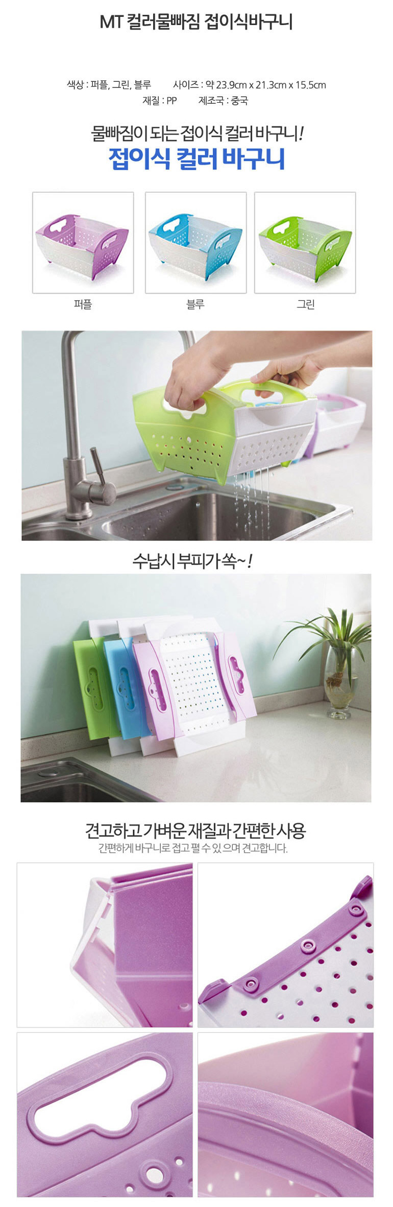 [도매직방] 물빠지는 접이식 컬러바구니 소쿠리 쟁반 채반