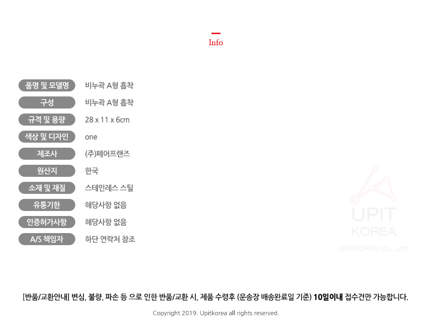 • 반품/환불조건: 도착후 1주일 이내 사용하지 않은 상태에서 가능합니다,초기제품 이상의 경우 동일한 제품으로 1:1 교환원칙, 사용후 제품이상은 A/S를 원칙으로 합니다,