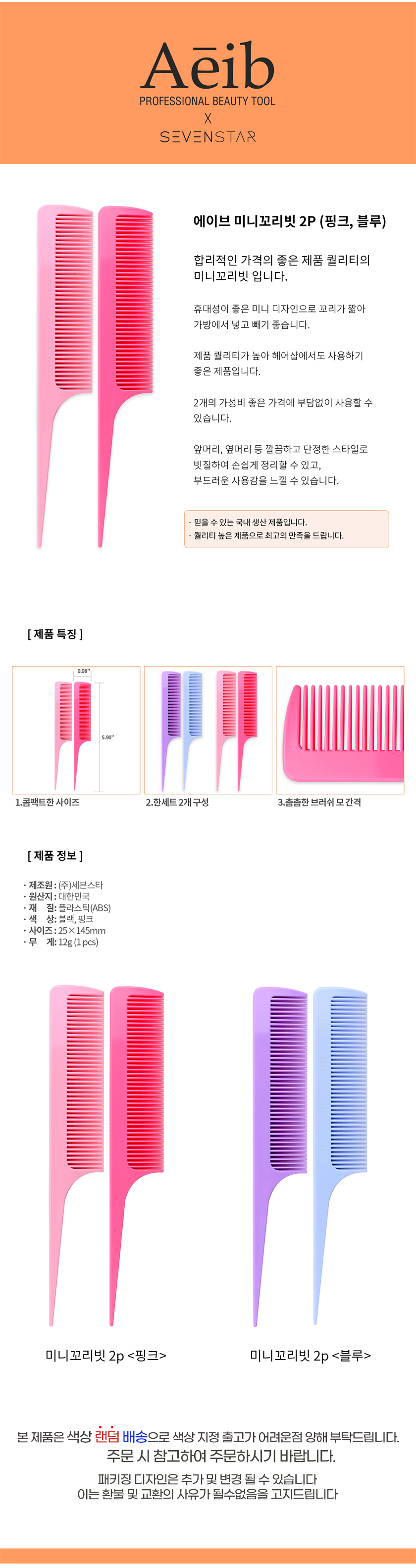 에이브 고급 미니 꼬리빗 2p(색상랜덤)