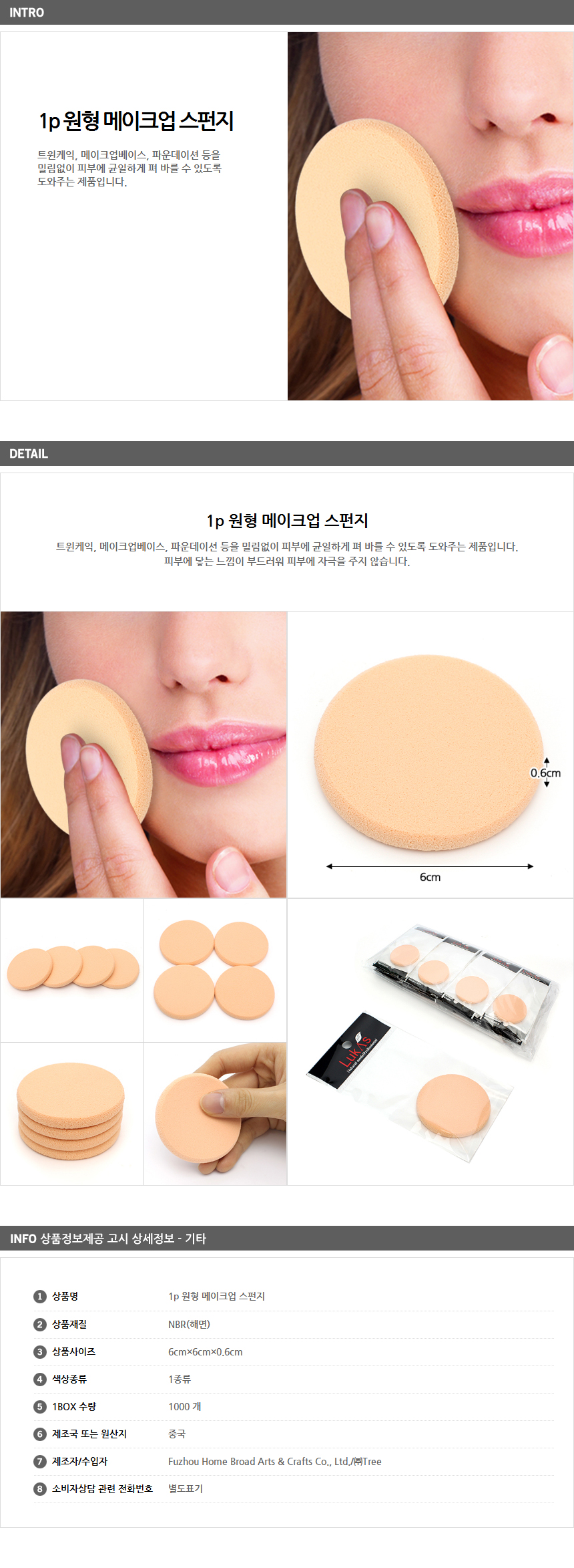 1. 품명 및 모델명 : 1p 원형 메이크업 스펀지(6cm×0.6cm)/미용