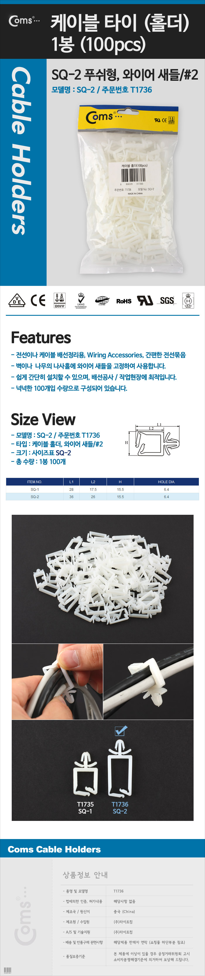 케이블 타이(홀더/100pcs) SQ-2 푸쉬형 와이어 새들/2 이미지/