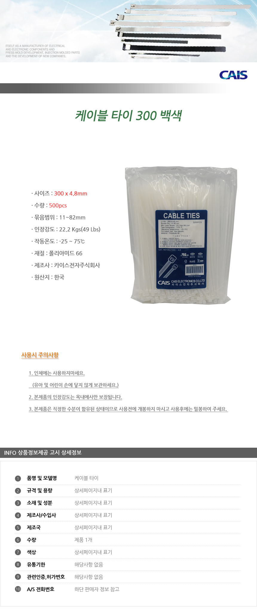 케이블타이 300mm 백색 500개입 케이블선정리