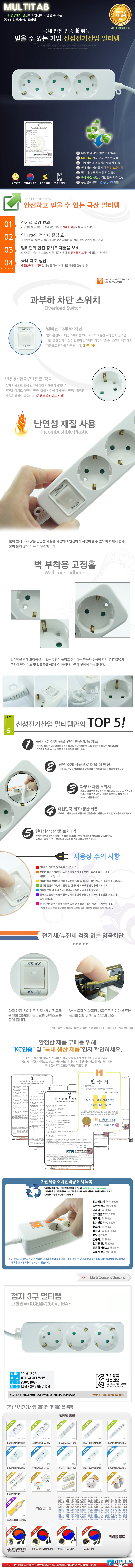 신성전기산업 국산 일반 멀티탭 콘센트 3구 5M(16A) 이미지/