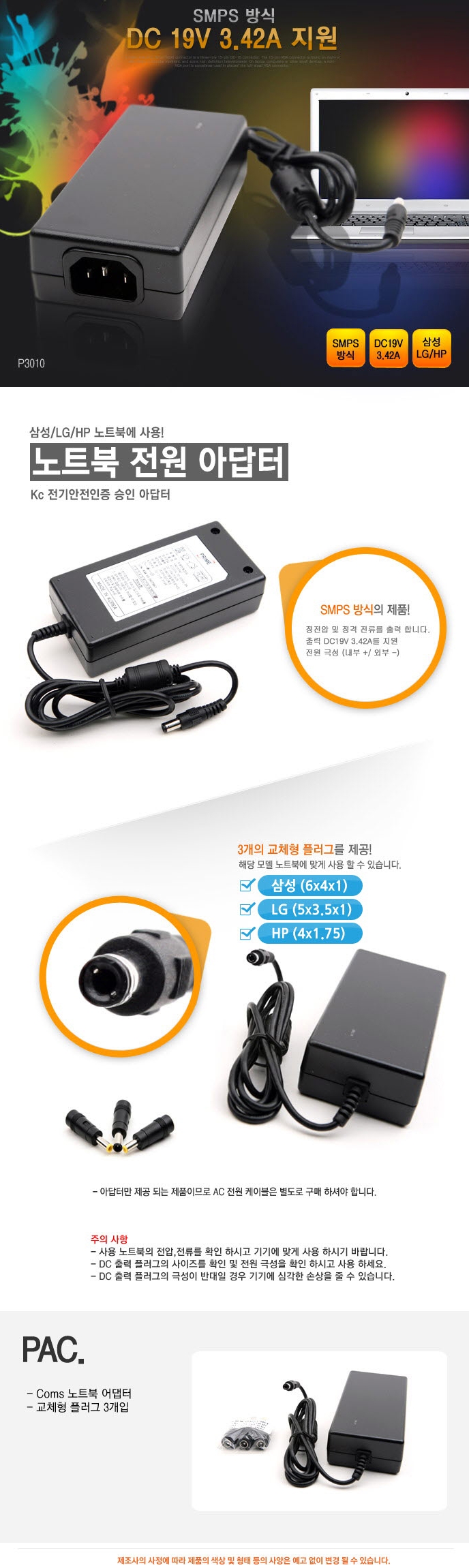 국산 노트북 어댑터/ DC 19V 3.42A 지원/삼성/LG/HP 노트북 사용/플러그 3개 이미지/