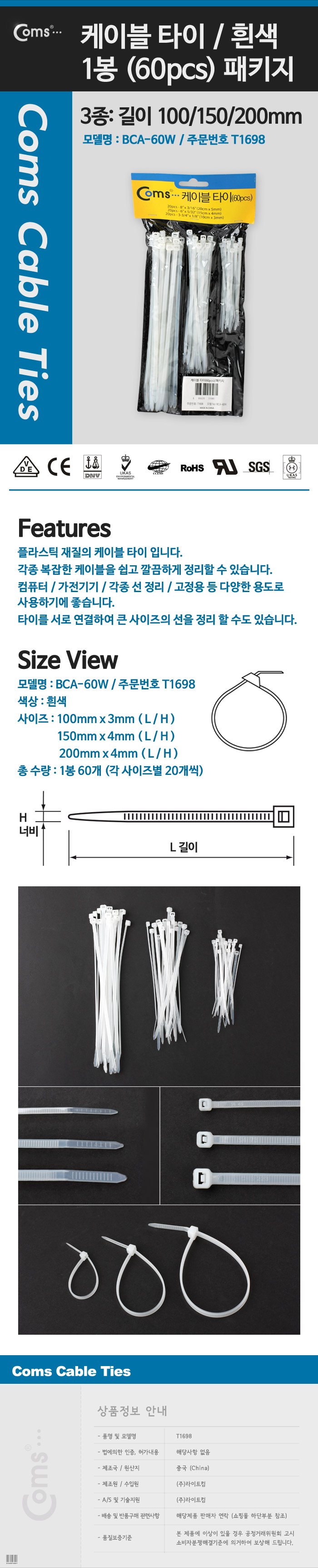 COMS 케이블 타이 60pcs 패키지 흰색W 100 150 200mm 이미지/